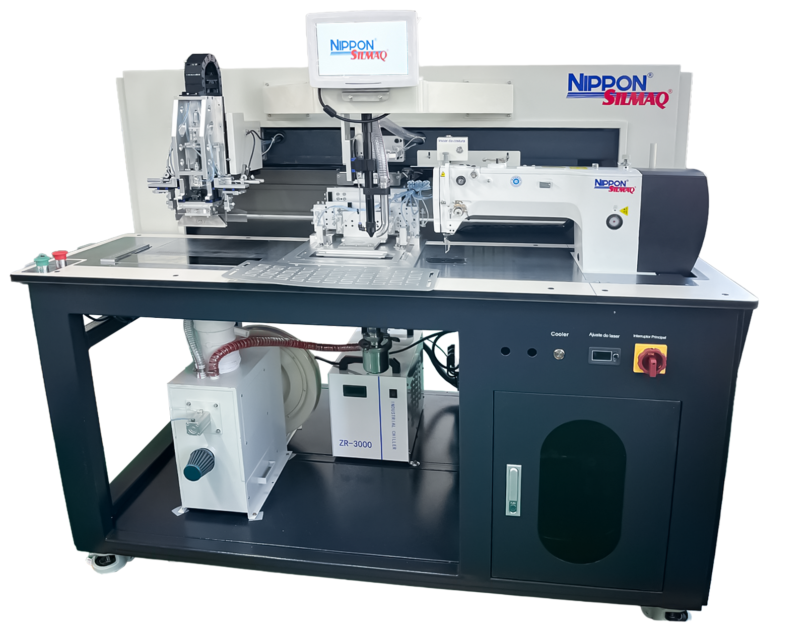 - Pedal para acionamento do clamp central (segura materiais longos, como calças e jaquetas, facilitando para que o operador possa fixar a peça na posição correta e também largar a peça para apertar o botão de iniciar o processo de fabricação, sem correr risco da peça se mover);