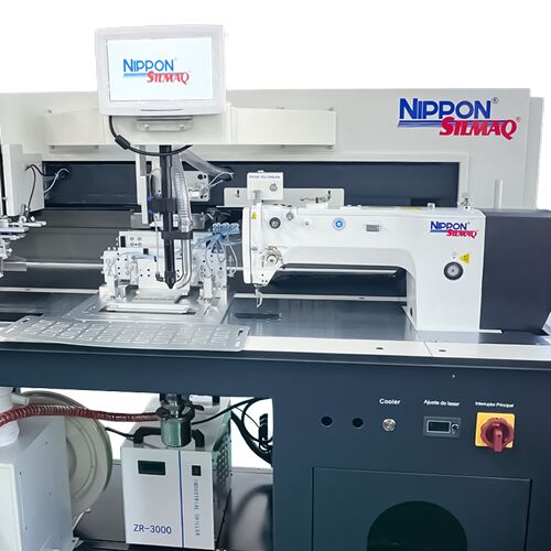 Costura automática para abertura, dobra e pesponto de vivo de bolso simples ou duplo.