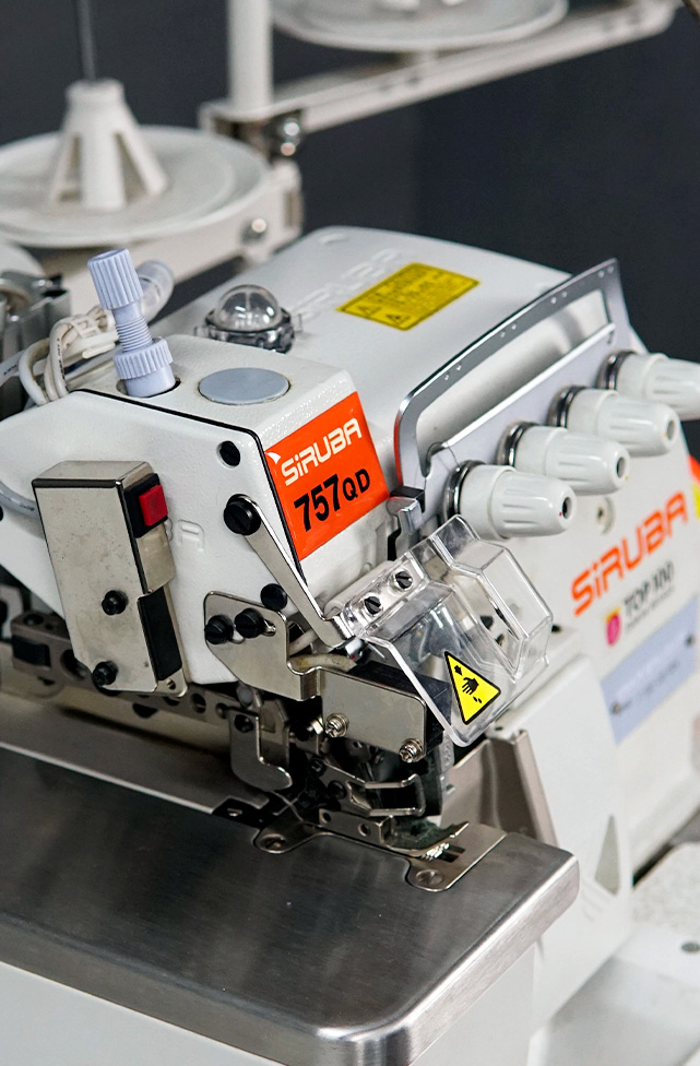 Máquina industrial de costura tipo “interlock” – ponto overlock junto de ponto corrente paralelo – para trabalhar materiais leves e médios, tanto na união quanto na limpeza das partes (chuleado). Tem estrutura compacta e essencial, ótima construção interna e externa, sistema moderno e projeto otimizado com cortador de correntinhas por sensor de fotocélula, sendo perfeita para indústrias de pequeno, médio e grande porte com um vasto leque de possíveis operações.