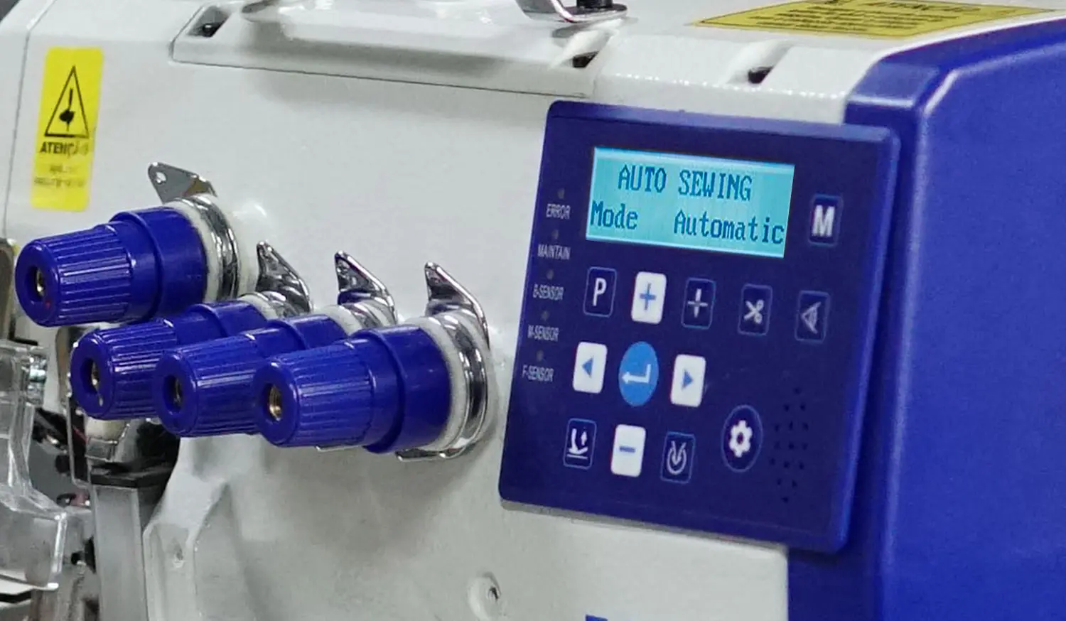 O equipamento conta com sistema de três sensores que acionam, de forma ordenada, o levantamento do calcador, o corte da correntinha [e a sucção dos resíduos – opcional vendido separadamente], evitando ações equivocadas na costura – O corte tem acionamento elétrico.