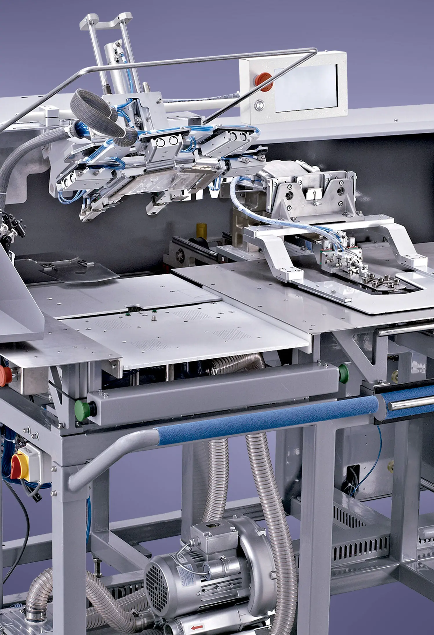 A troca de mecanismos é simplificada com a disponibilidade de moldes variados de bolsos, inclusive com forma retrátil que permite pespontos duplos. Conta com diversos dispositivos de segurança e sensores, além do poderoso motor servo eletrônico de 700W que entrega potência de trabalho e qualidade dos pontos. É capaz de atender tanto indústrias de médio porte com pedidos limitados quanto as grandes confecções, estas com demandas que exigem padronização e resultados rápidos.