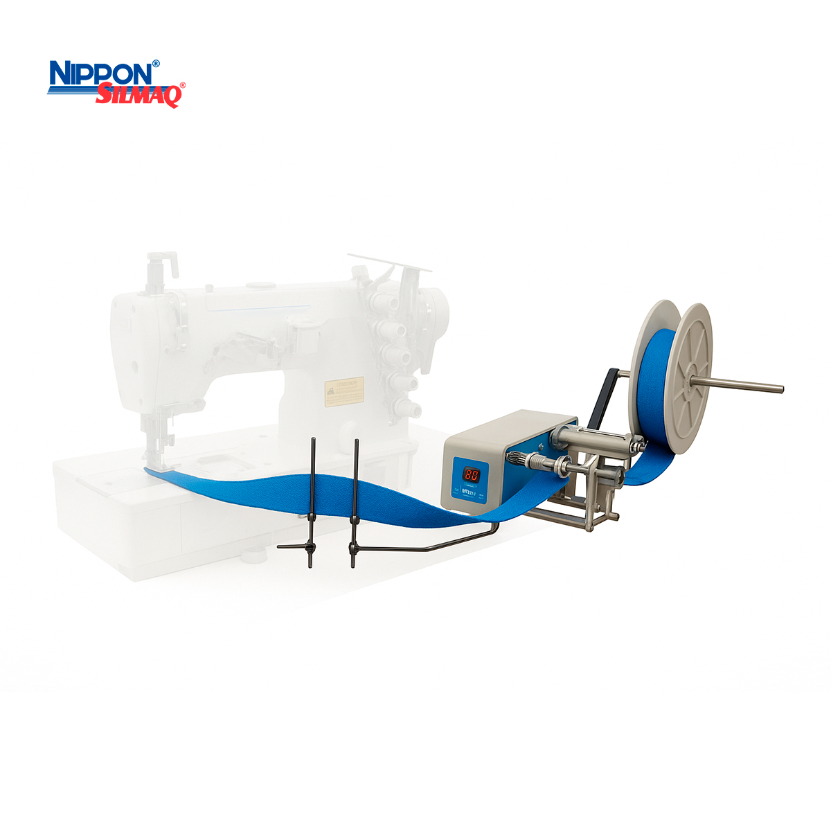 Dosador de tiras lateral, avisa quando vai haver trancos, evitando perda de peças. Aparelho de fácil instalação, sem ruído, com baixo custo e consumo. Conduz o material a ser aplicado até a entrada do aparelho sem tensão, deixando o material livre na aplicação da peça, evitando franzimentos ou diferenças de medidas de viés.