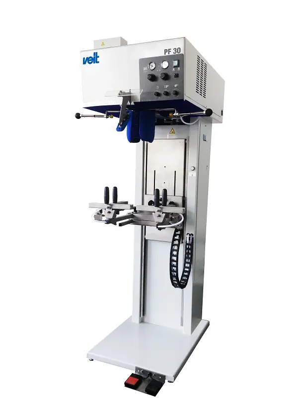 Máquina automática tipo TOPPER para Finalização de Calças e Bermudas Jeans através de vapor de agua aquecida. Possui pinças para segurar as pernas com sistema automático de esticamento e regulagem de altura, sistema Zero Estiramento, que permite o acabamento de peças de tecidos elásticos sensíveis e evita a deformação nas peças. Painel de controle com regulagem de tempo e vazão de vapor.