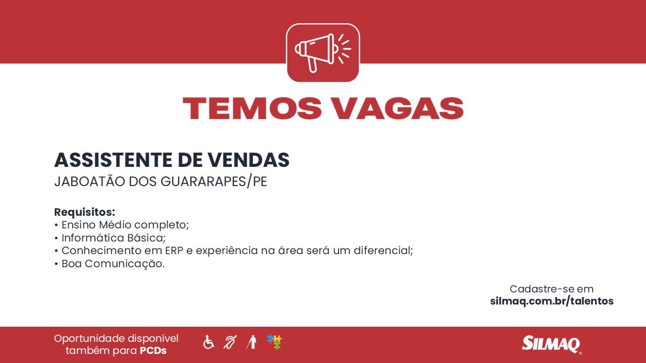 Procuramos um Assistente de Vendas para completar nosso time em nossa unidade de Jaboatão dos Guararapes/PE. Você é apaixonado por desafios, gosta de fazer a diferença e deseja fortalecer sua carreira com a experiência em uma empresa reconhecida nacionalmente? Então o seu lugar é aqui!