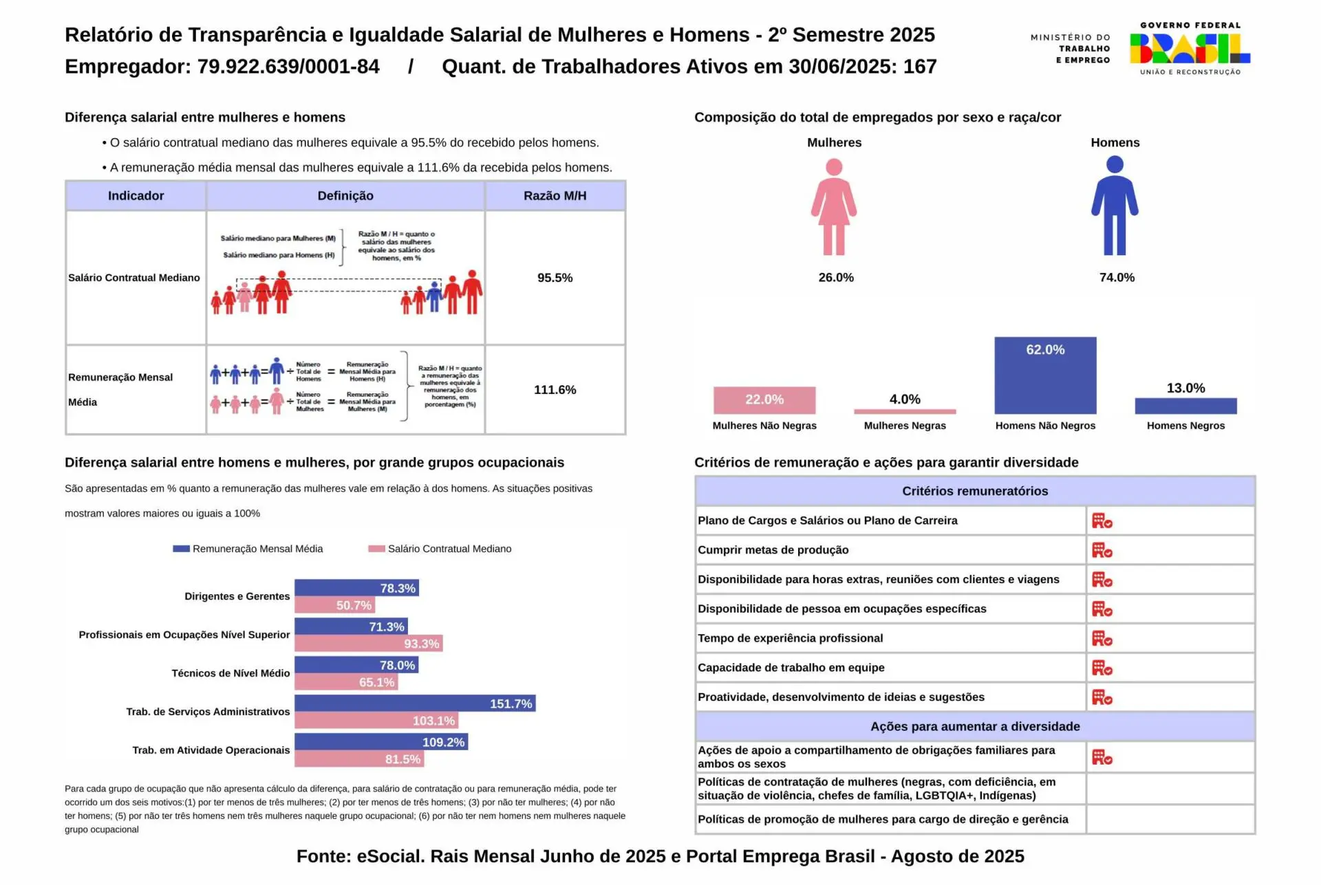 - Desde o início, trabalhamos para garantir um ambiente inclusivo e justo, onde o talento, a dedicação e a competência são os únicos fatores que influenciam a remuneração. Esta prática está alinhada também com a nossa cultura organizacional, que reforça a importância da equidade de gênero no mercado de trabalho.